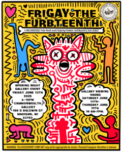 After attracting over 400 attendees to Hilary Falk’s house during its debut year, the event found a new home in the Common Wealth Gallery, located inside the Madison Enterprise Center. This marks its second year in the gallery- a centrally-located and accessible space that is sober-friendly, neurodivergent-positive, and open to all, including those who have never attended an art event before but feel called by the strange spiritual hum of the Furb. This year’s exhibition includes a blend of heartfelt, hilarious, and occasionally degenerate art — some works may include adult themes, and parental/guardian discretion is advised for younger attendees. Friday the Furbteenth has always been a pay-what-you-can show, with no percentage taken from artist sales and low vendor fees to encourage a joyful and low-stakes art celebration for all.